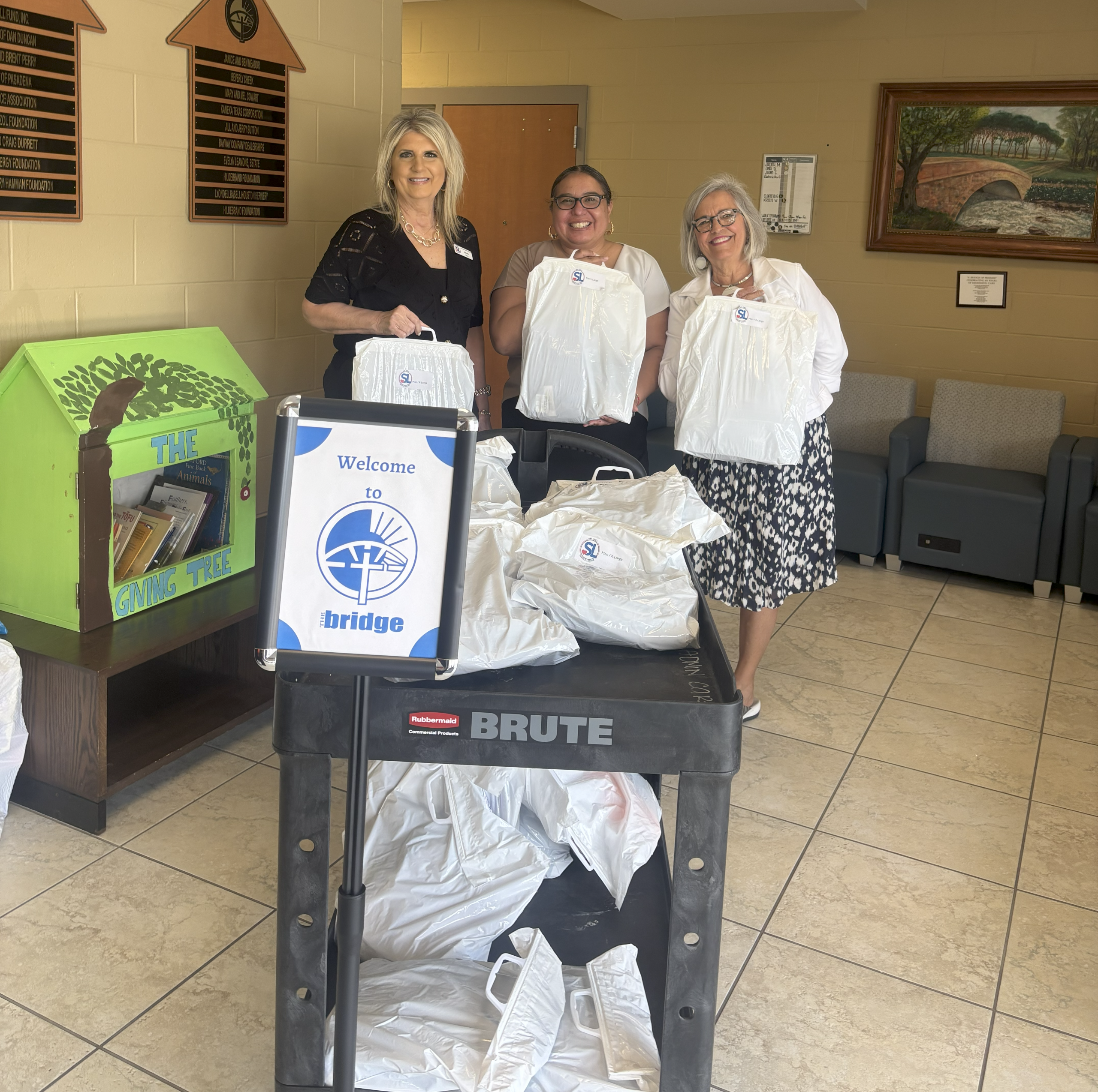 Mindy Maas (left) and Vicky Jones (right) recently delivered Caring Kits from the Bay Area Service League to The Bridge Over Troubled Waters.